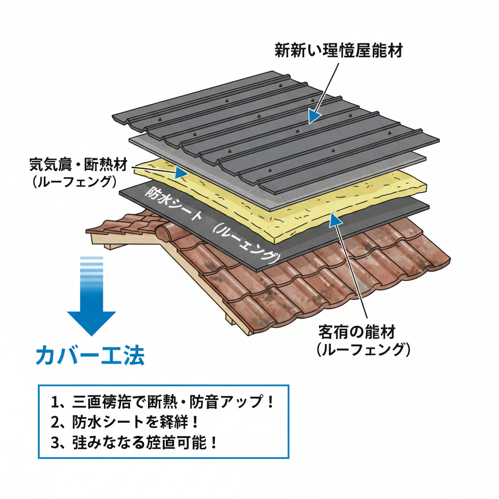 現在の屋根の上に新しい軽量屋根材を重ねる
